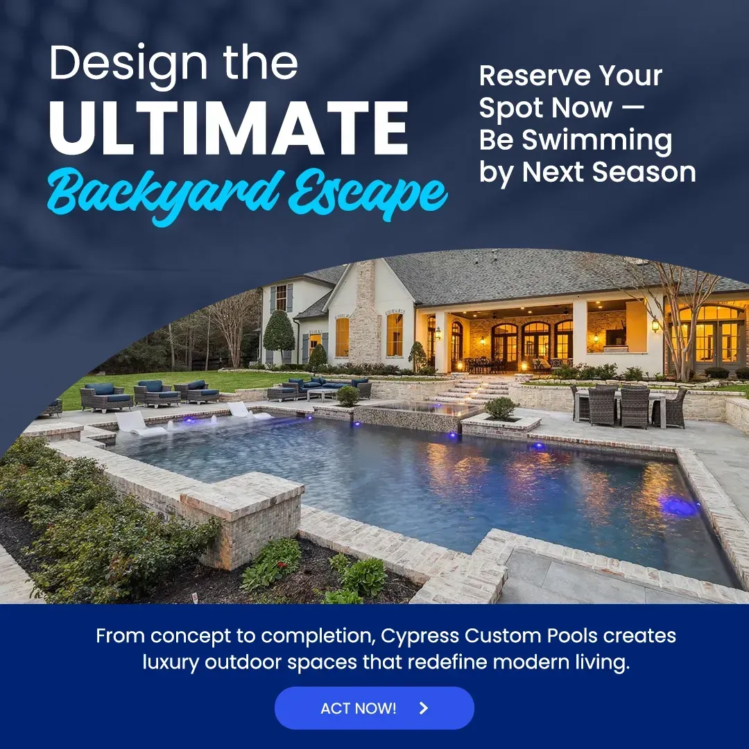 Turn your vision into a reality with Cypress Custom Pools — where innovation meets craftsmanship. Get on our schedule today and be swimming by next season.